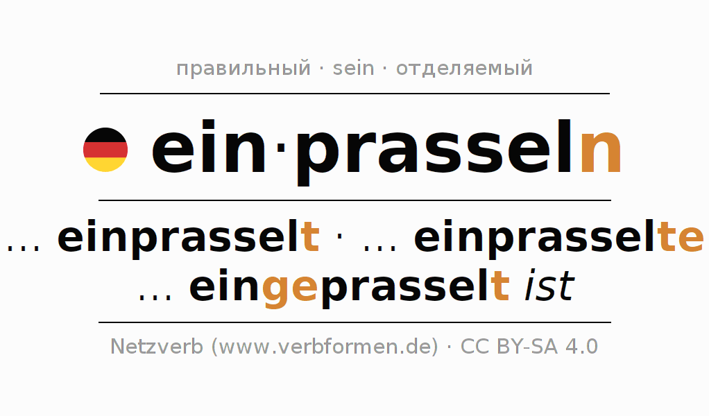 Этот глагол einprasseln полностью спрягается во всех лицах и числах Партицип Презенс Перфект.