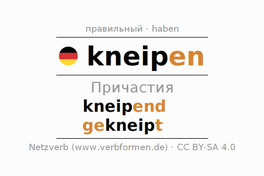 Спряжение kneipen в Партицип Презенс Перфект часть речи Действительный залог (актив): kneipend, gekneipt.Образование этих форм происходит по определённым грамматическим правилам. Так же спрягаются простые глагольные формы kneipen в Партицип. Kомментарии ☆