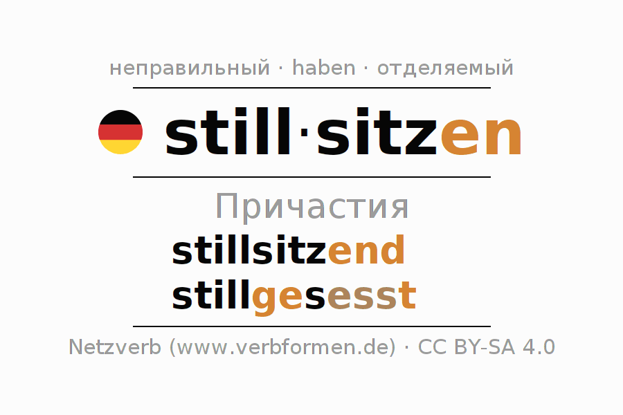 Спряжение stillsitzen в Партицип Презенс Перфект часть речи Действительный залог (актив): stillsitzend, stillgesesst.Образование этих форм происходит по определённым грамматическим правилам. Так же спрягаются простые глагольные формы stillsitzen в Партицип. Kомментарии ☆