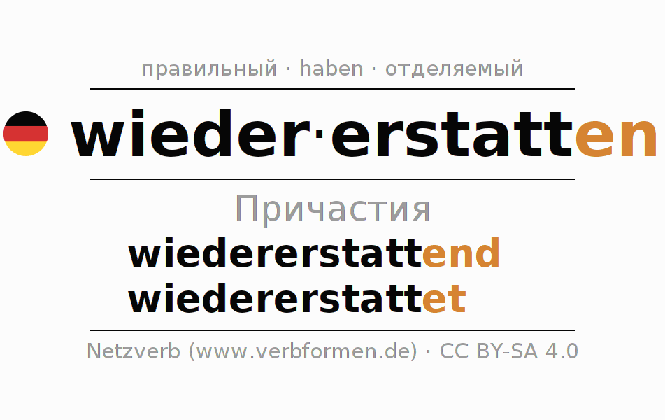 Спряжение wiedererstatten в Партицип Презенс Перфект часть речи Действительный залог (актив): wiedererstattend, wiedererstattet.Образование этих форм происходит по определённым грамматическим правилам. Так же спрягаются простые глагольные формы wiedererstatten в Партицип. Kомментарии ☆