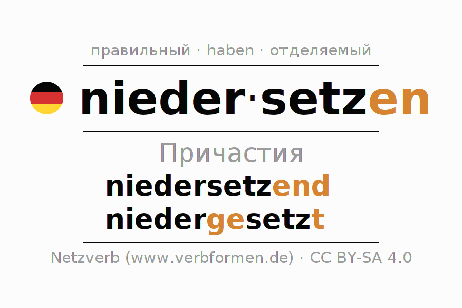 Формами причастия niedersetzen (поставить, занимать место) являются: {PARTIZIP 1}, {PARTIZIP 2}