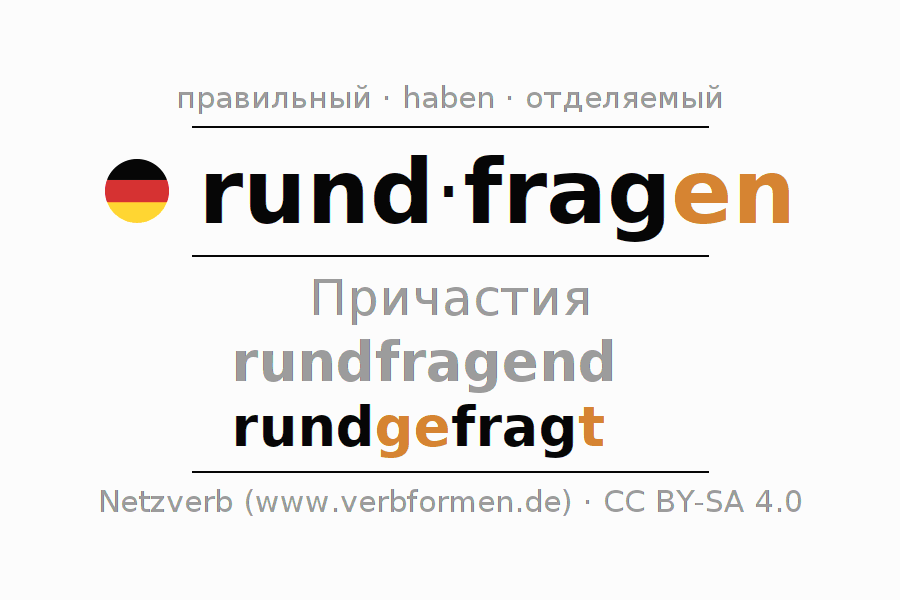 Формами причастия rundfragen (опросить, спросить) являются: {PARTIZIP 1}, {PARTIZIP 2}