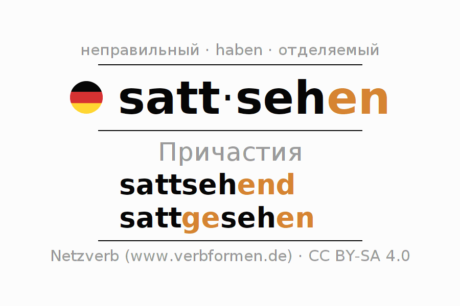 Формами причастия sattsehen (вдоволь наглядеться, вдоволь налюбоваться) являются: {PARTIZIP 1}, {PARTIZIP 2}
