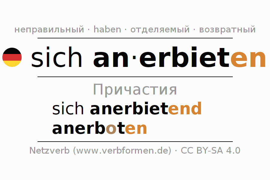 Формами причастия sich anerbieten (предложить, вызваться) являются: {PARTIZIP 1}, {PARTIZIP 2}