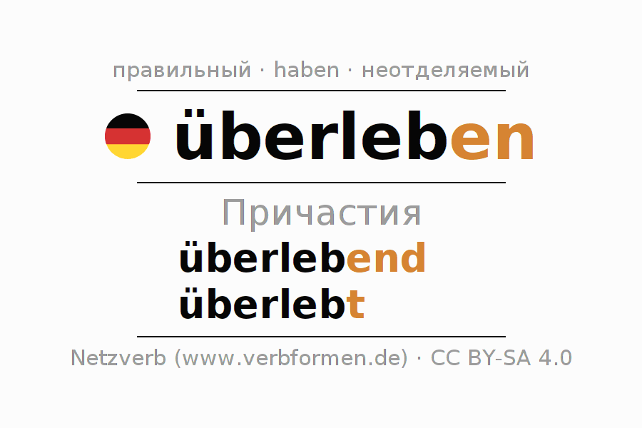 Формами причастия überleben (выжить, пережить) являются: {PARTIZIP 1}, {PARTIZIP 2}