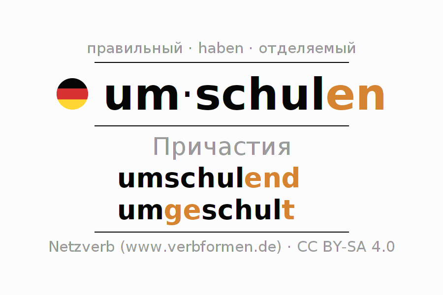 Формами причастия umschulen (переквалифицировать, переквалифицироваться) являются: {PARTIZIP 1}, {PARTIZIP 2}