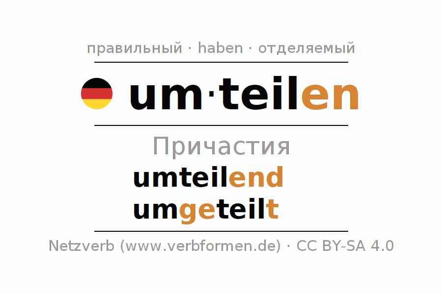 Формами причастия umteilen (перераспределять, переупорядочивать) являются: {PARTIZIP 1}, {PARTIZIP 2}