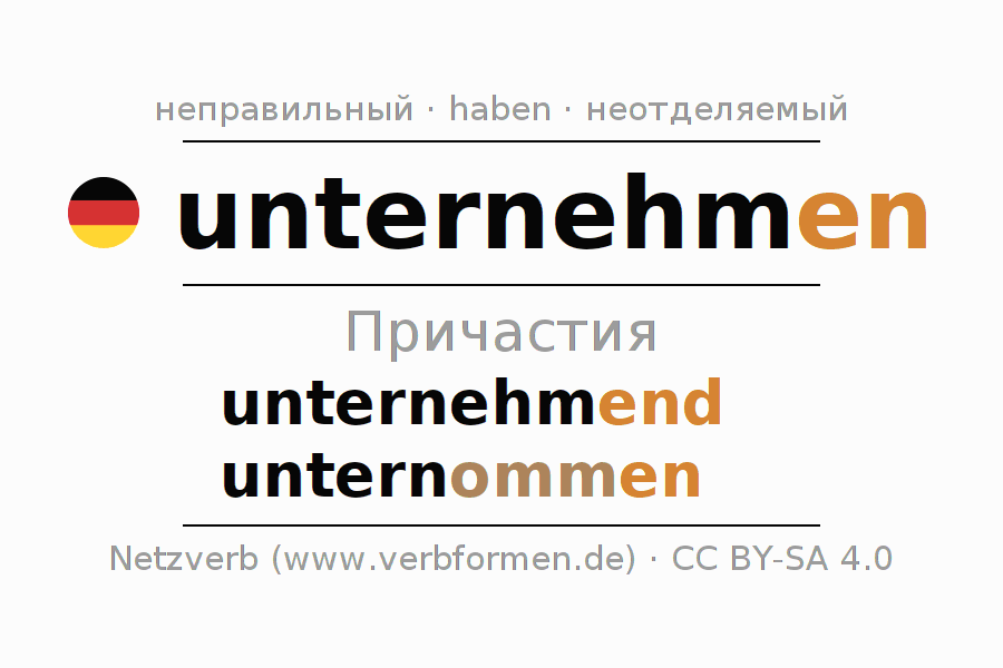 Формами причастия unternehmen (предпринимать, браться) являются: {PARTIZIP 1}, {PARTIZIP 2}