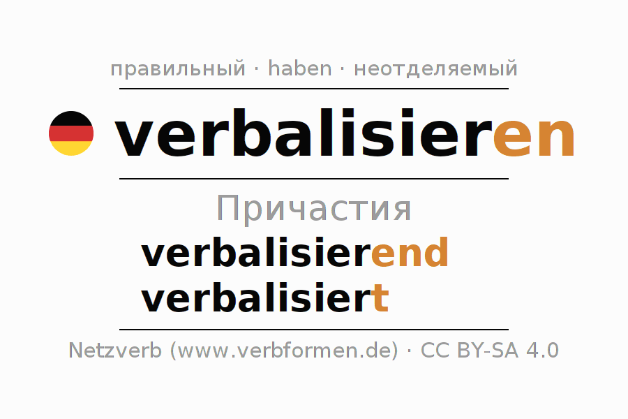 Формами причастия verbalisieren (вербализировать, формулировать) являются: {PARTIZIP 1}, {PARTIZIP 2}