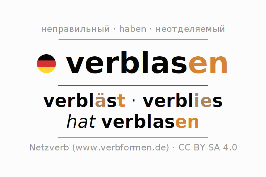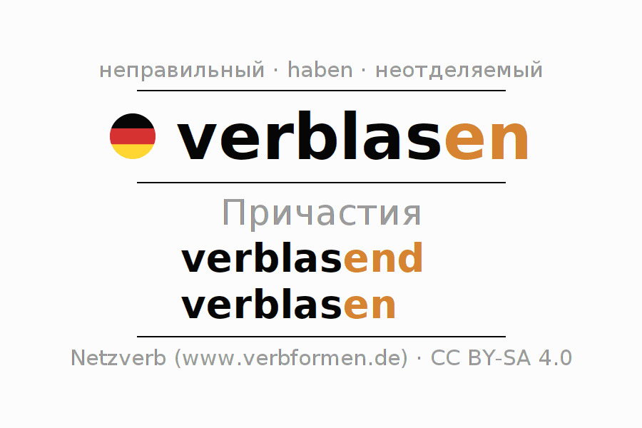Формами причастия verblasen (передавать, фальшивить) являются: {PARTIZIP 1}, {PARTIZIP 2}
