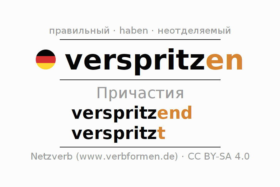 Формами причастия verspritzen (забрызгать, разбрызгивать) являются: {PARTIZIP 1}, {PARTIZIP 2}