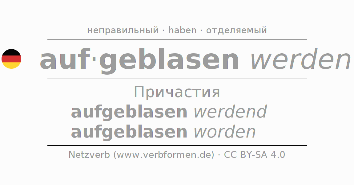 Спряжение aufblasen в Партицип Презенс Перфект часть речи Пассив с werden: aufgeblasen werdend, aufgeblasen worden.Образование этих форм происходит по определённым грамматическим правилам. Так же спрягаются простые глагольные формы aufblasen в Партицип. Kомментарии ☆
