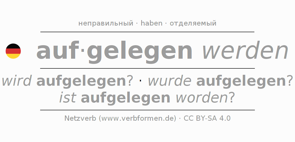 Спряжение aufliegen в Партицип Презенс Перфект часть речи Пассив с werden: aufgelegen werdend, aufgelegen worden.Образование этих форм происходит по определённым грамматическим правилам. Так же спрягаются простые глагольные формы aufliegen в Партицип. Kомментарии ☆