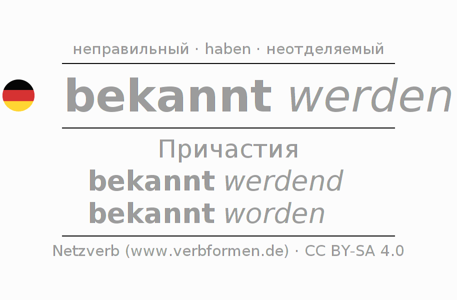 Спряжение bekennen в Партицип Презенс Перфект часть речи Пассив с werden: bekannt werdend, bekannt worden.Образование этих форм происходит по определённым грамматическим правилам. Так же спрягаются простые глагольные формы bekennen в Партицип. Kомментарии ☆