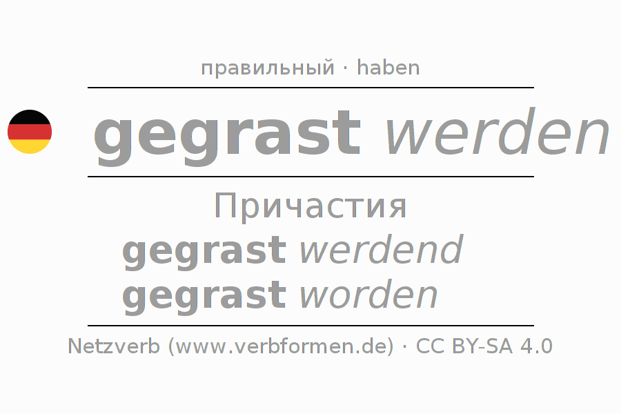 Спряжение grasen в Партицип Презенс Перфект часть речи Пассив с werden: gegrast werdend, gegrast worden.Образование этих форм происходит по определённым грамматическим правилам. Так же спрягаются простые глагольные формы grasen в Партицип. Kомментарии ☆