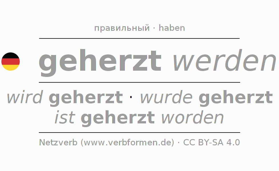 Спряжение herzen в Партицип Презенс Перфект часть речи Пассив с werden: geherzt werdend, geherzt worden.Образование этих форм происходит по определённым грамматическим правилам. Так же спрягаются простые глагольные формы herzen в Партицип. Kомментарии ☆