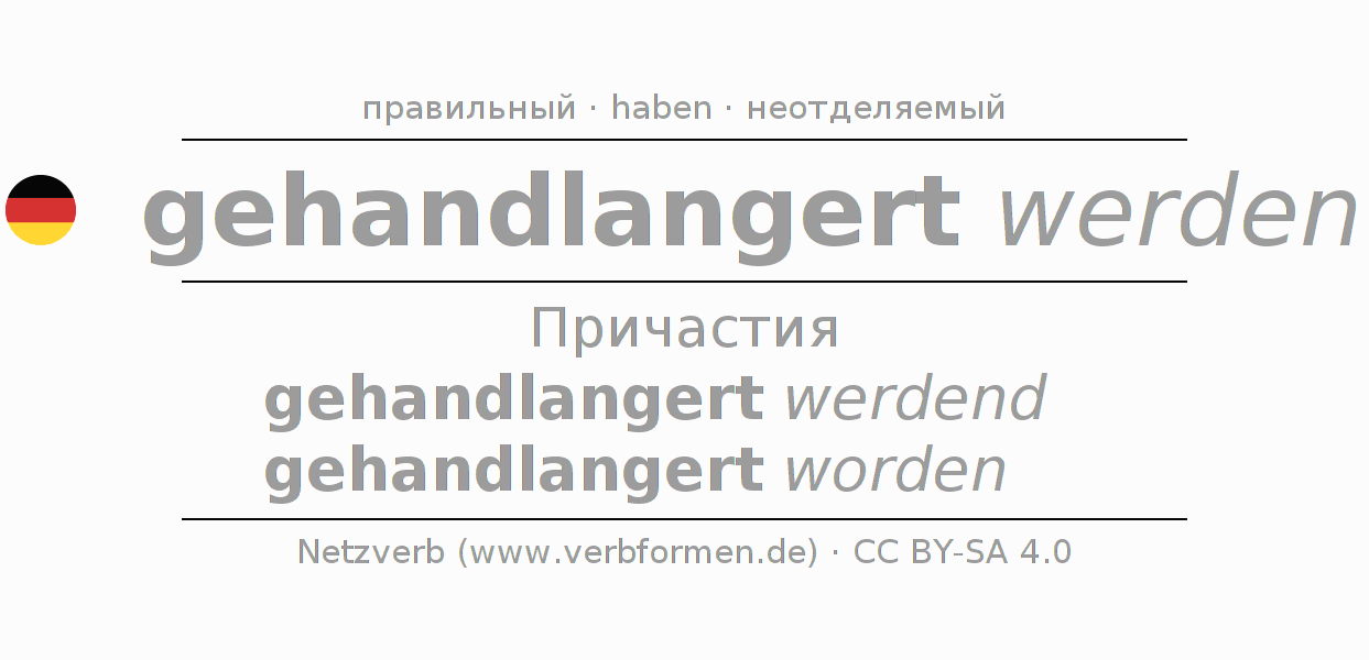 Спряжение handlangern в Партицип Презенс Перфект часть речи Пассив с werden: gehandlangert werdend, gehandlangert worden.Образование этих форм происходит по определённым грамматическим правилам. Так же спрягаются простые глагольные формы handlangern в Партицип. Kомментарии ☆