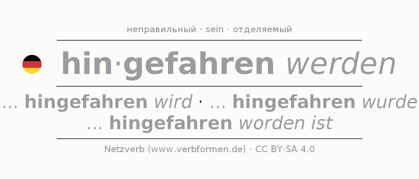 Спряжение hinfahren в Партицип Презенс Перфект часть речи Пассив с werden: hingefahren werdend, hingefahren worden.Образование этих форм происходит по определённым грамматическим правилам. Так же спрягаются простые глагольные формы hinfahren в Партицип. 1Комментарий ☆