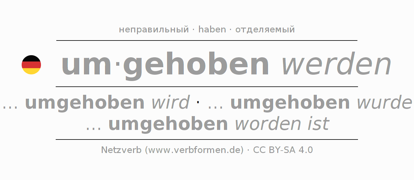 Спряжение umheben в Партицип Презенс Перфект часть речи Пассив с werden: umgehoben werdend, umgehoben worden.Образование этих форм происходит по определённым грамматическим правилам. Так же спрягаются простые глагольные формы umheben в Партицип. Kомментарии ☆