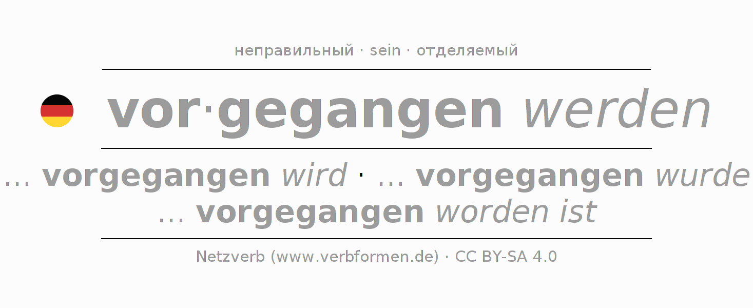 Спряжение vorgehen в Партицип Презенс Перфект часть речи Пассив с werden: vorgegangen werdend, vorgegangen worden.Образование этих форм происходит по определённым грамматическим правилам. Так же спрягаются простые глагольные формы vorgehen в Партицип. Kомментарии ☆