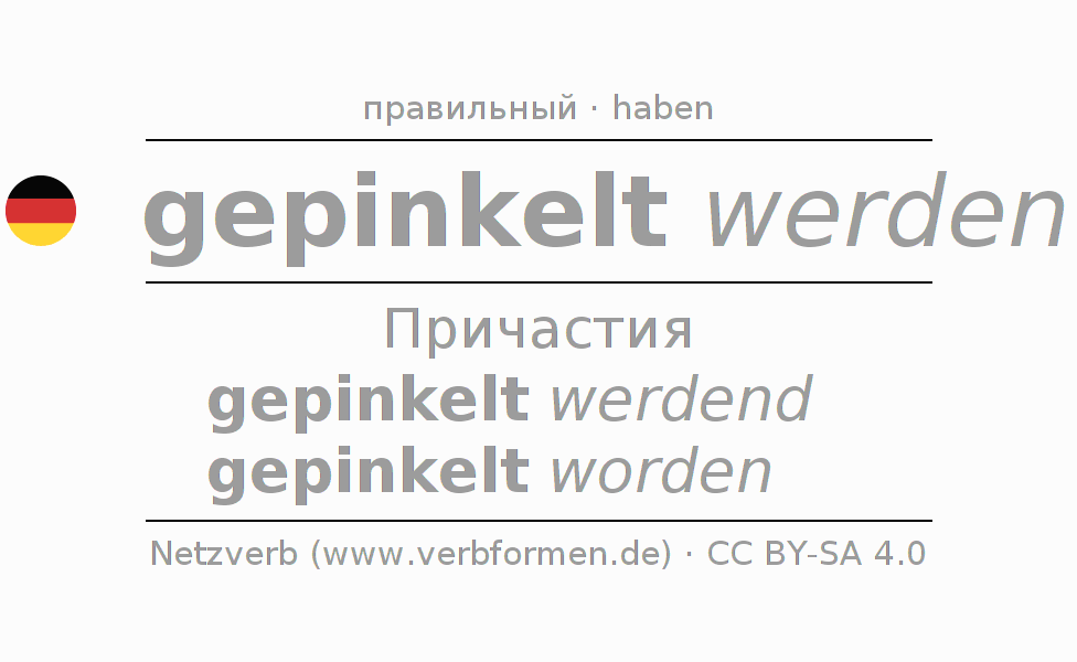 Спряжение pinkeln в Партицип Презенс Перфект часть речи Пассив с werden: gepinkelt werdend, gepinkelt worden.Образование этих форм происходит по определённым грамматическим правилам. Так же спрягаются простые глагольные формы pinkeln в Партицип. Kомментарии ☆
