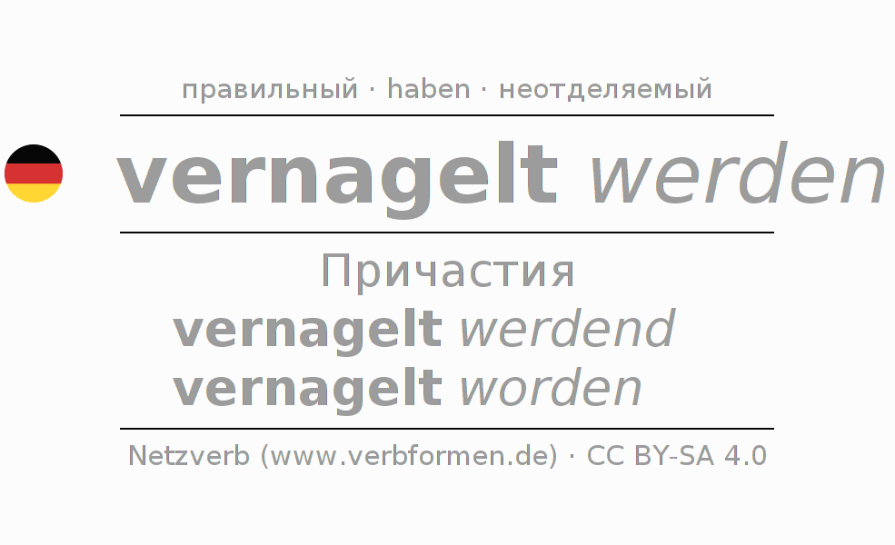Спряжение vernageln в Партицип Презенс Перфект часть речи Пассив с werden: vernagelt werdend, vernagelt worden.Образование этих форм происходит по определённым грамматическим правилам. Так же спрягаются простые глагольные формы vernageln в Партицип. Kомментарии ☆