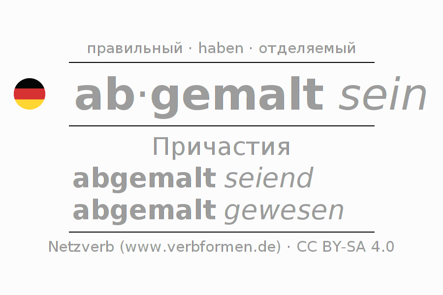 Спряжение abmalen в Партицип Презенс Перфект часть речи Пассив с sein: abgemalt seiend, abgemalt gewesen.Образование этих форм происходит по определённым грамматическим правилам. Так же спрягаются простые глагольные формы abmalen в Партицип. Kомментарии ☆