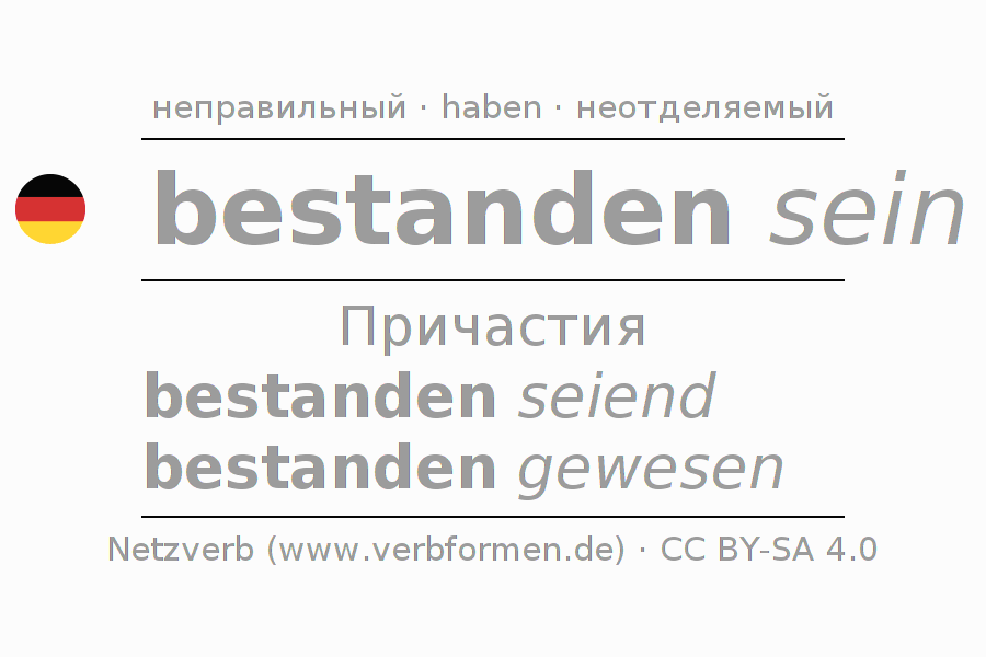 Спряжение bestehen в Партицип Презенс Перфект часть речи Пассив с sein: bestanden seiend, bestanden gewesen.Образование этих форм происходит по определённым грамматическим правилам. Так же спрягаются простые глагольные формы bestehen в Партицип. Kомментарии ☆