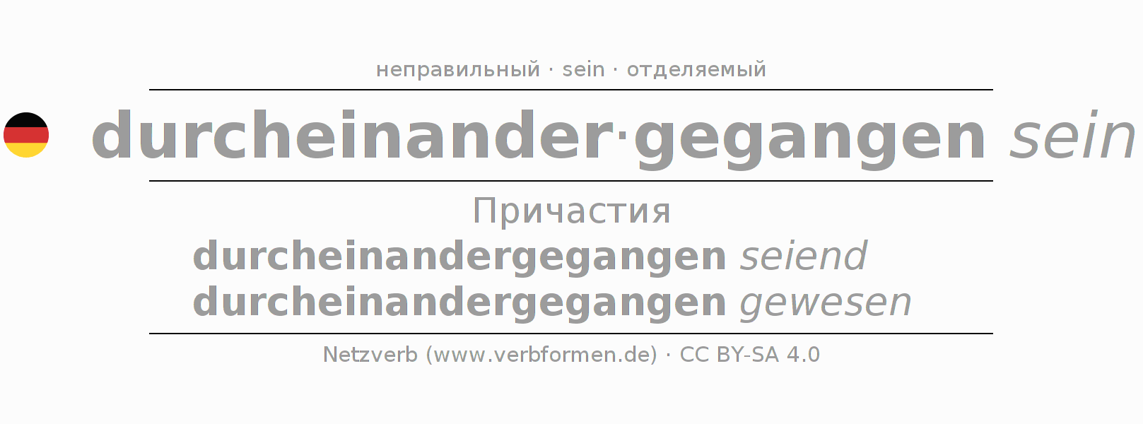 Спряжение durcheinandergehen в Партицип Презенс Перфект часть речи Пассив с sein: durcheinandergegangen seiend, durcheinandergegangen gewesen.Образование этих форм происходит по определённым грамматическим правилам. Так же спрягаются простые глагольные формы durcheinandergehen в Партицип. Kомментарии ☆