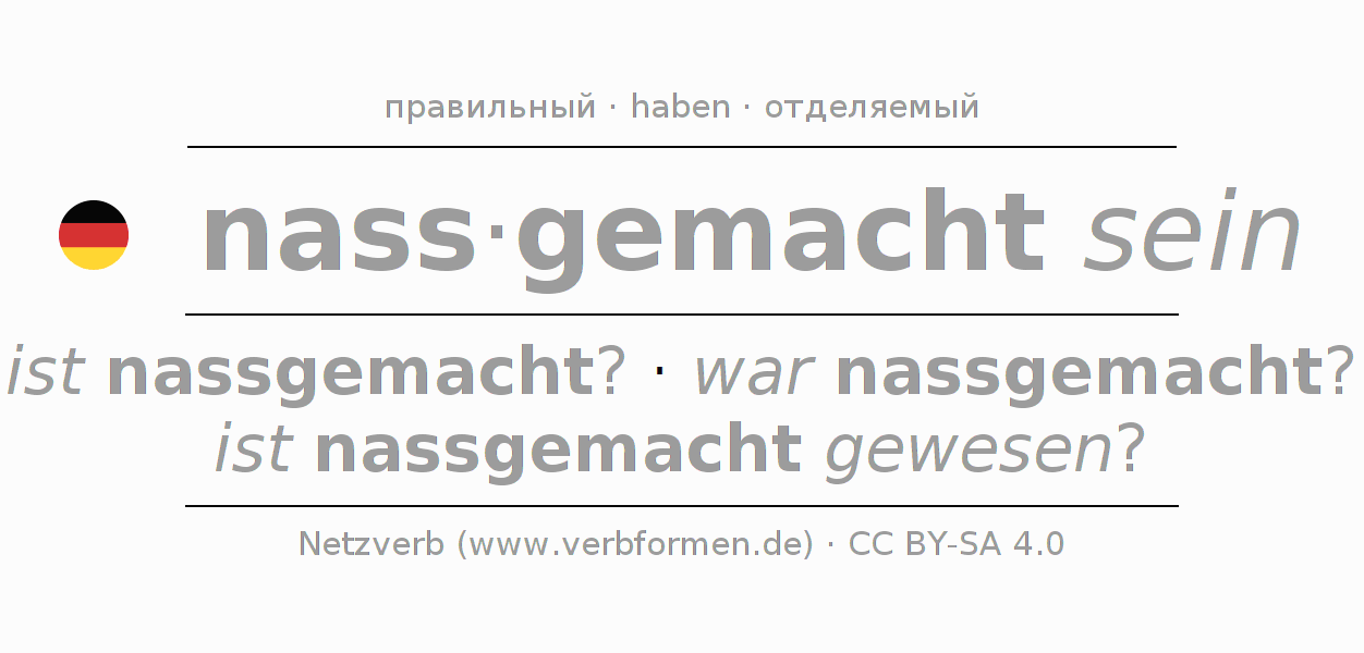 Спряжение nassmachen в Партицип Презенс Перфект часть речи Пассив с sein: nassgemacht seiend, nassgemacht gewesen.Образование этих форм происходит по определённым грамматическим правилам. Так же спрягаются простые глагольные формы nassmachen в Партицип. Kомментарии ☆