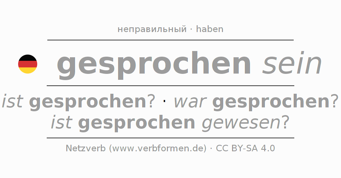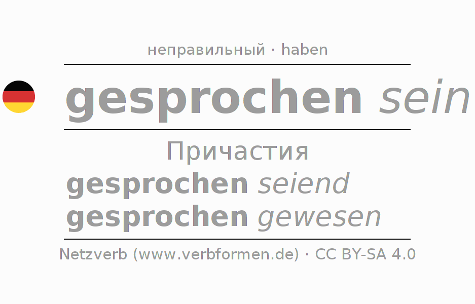 Спряжение sprechen в Партицип Презенс Перфект часть речи Пассив с sein: gesprochen seiend, gesprochen gewesen.Образование этих форм происходит по определённым грамматическим правилам. Так же спрягаются простые глагольные формы sprechen в Партицип. 1Комментарий ☆