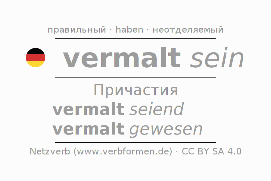 Спряжение vermalen в Партицип Презенс Перфект часть речи Пассив с sein: vermalt seiend, vermalt gewesen.Образование этих форм происходит по определённым грамматическим правилам. Так же спрягаются простые глагольные формы vermalen в Партицип. Kомментарии ☆