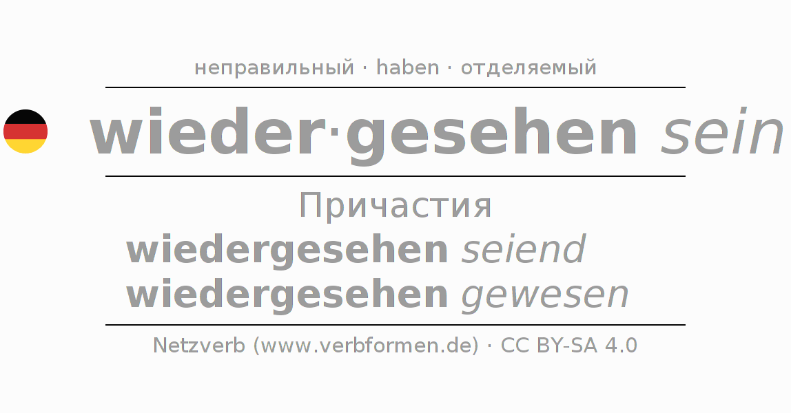 Спряжение wiedersehen в Партицип Презенс Перфект часть речи Пассив с sein: wiedergeseh(e)n seiend, wiedergeseh(e)n gewesen.Образование этих форм происходит по определённым грамматическим правилам. Так же спрягаются простые глагольные формы wiedersehen в Партицип. Kомментарии ☆