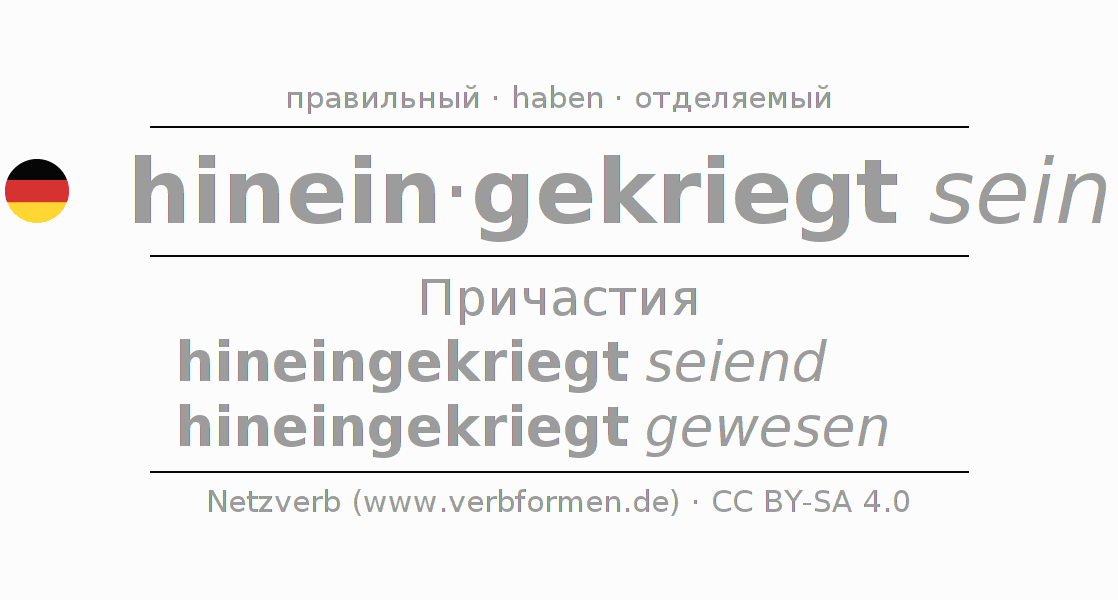 Спряжение hineinkriegen в Партицип Презенс Перфект часть речи Пассив с sein: hineingekriegt seiend, hineingekriegt gewesen.Образование этих форм происходит по определённым грамматическим правилам. Так же спрягаются простые глагольные формы hineinkriegen в Партицип. Kомментарии ☆