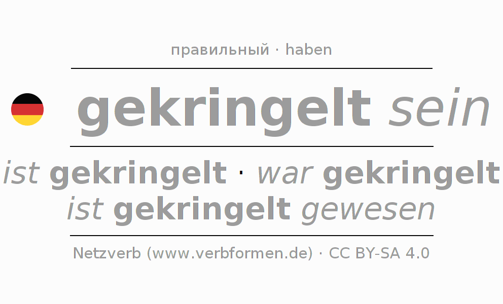 Спряжение kringeln в Партицип Презенс Перфект часть речи Пассив с sein: gekringelt seiend, gekringelt gewesen.Образование этих форм происходит по определённым грамматическим правилам. Так же спрягаются простые глагольные формы kringeln в Партицип. Kомментарии ☆