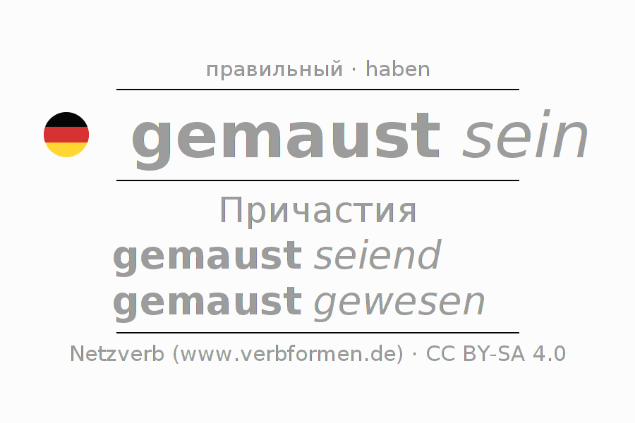 Спряжение mausen в Партицип Презенс Перфект часть речи Пассив с sein: gemaust seiend, gemaust gewesen.Образование этих форм происходит по определённым грамматическим правилам. Так же спрягаются простые глагольные формы mausen в Партицип. Kомментарии ☆