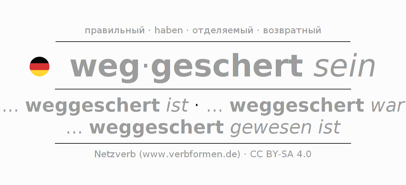Спряжение sich wegscheren в Партицип Презенс Перфект часть речи Пассив с sein: weggeschert seiend, weggeschert gewesen.Образование этих форм происходит по определённым грамматическим правилам. Так же спрягаются простые глагольные формы wegscheren в Партицип. Kомментарии ☆