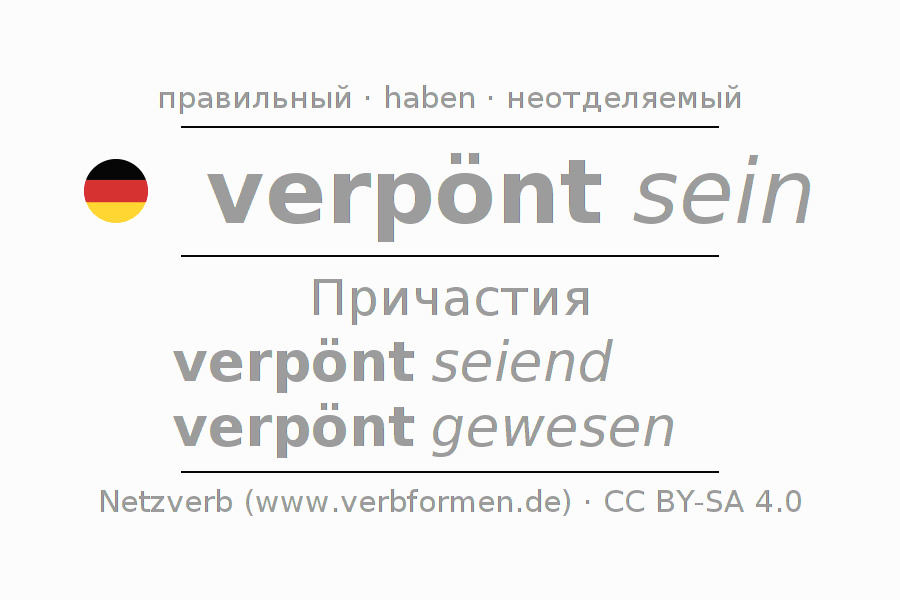 Спряжение verpönen в Партицип Презенс Перфект часть речи Пассив с sein: verpönt seiend, verpönt gewesen.Образование этих форм происходит по определённым грамматическим правилам. Так же спрягаются простые глагольные формы verpönen в Партицип. Kомментарии ☆