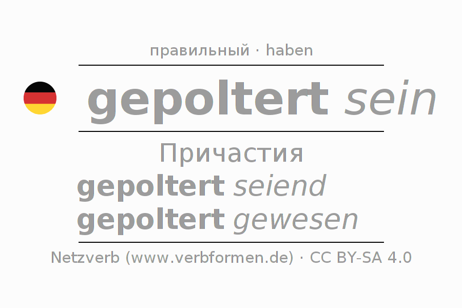 Спряжение poltern в Партицип Презенс Перфект часть речи Пассив с sein: gepoltert seiend, gepoltert gewesen.Образование этих форм происходит по определённым грамматическим правилам. Так же спрягаются простые глагольные формы poltern в Партицип. Kомментарии ☆