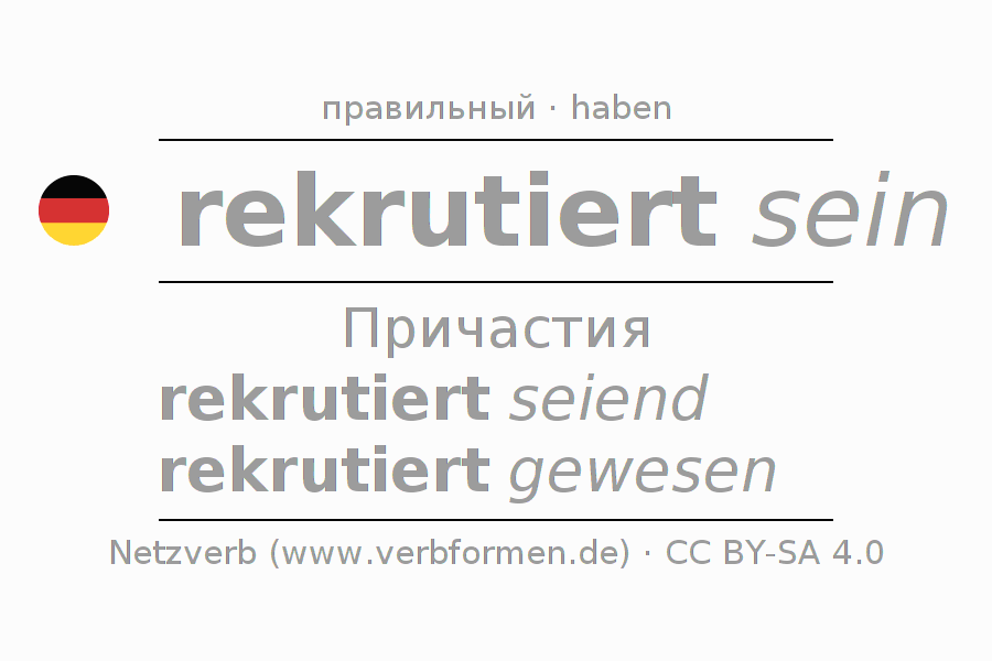 Спряжение rekrutieren в Партицип Презенс Перфект часть речи Пассив с sein: rekrutiert seiend, rekrutiert gewesen.Образование этих форм происходит по определённым грамматическим правилам. Так же спрягаются простые глагольные формы rekrutieren в Партицип. Kомментарии ☆