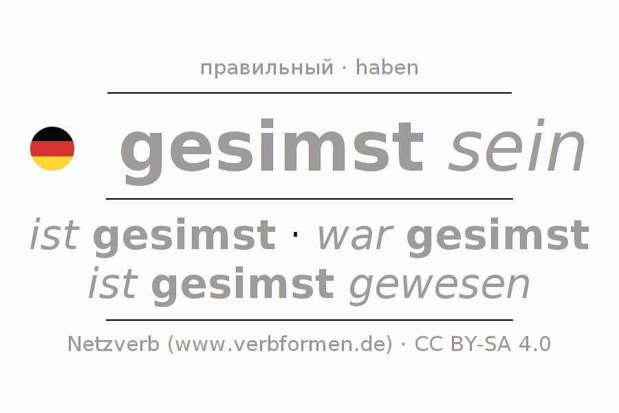 Спряжение simsen в Партицип Презенс Перфект часть речи Пассив с sein: gesimst seiend, gesimst gewesen.Образование этих форм происходит по определённым грамматическим правилам. Так же спрягаются простые глагольные формы simsen в Партицип. Kомментарии ☆