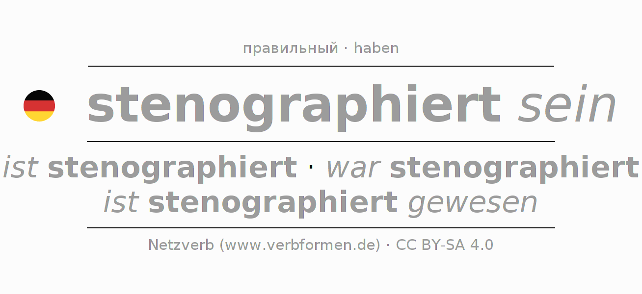 Спряжение stenographieren в Партицип Презенс Перфект часть речи Пассив с sein: stenographiert seiend, stenographiert gewesen.Образование этих форм происходит по определённым грамматическим правилам. Так же спрягаются простые глагольные формы stenographieren в Партицип. Kомментарии ☆