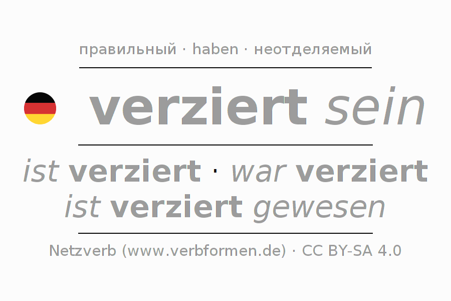 Спряжение verzieren в Партицип Презенс Перфект часть речи Пассив с sein: verziert seiend, verziert gewesen.Образование этих форм происходит по определённым грамматическим правилам. Так же спрягаются простые глагольные формы verzieren в Партицип. Kомментарии ☆