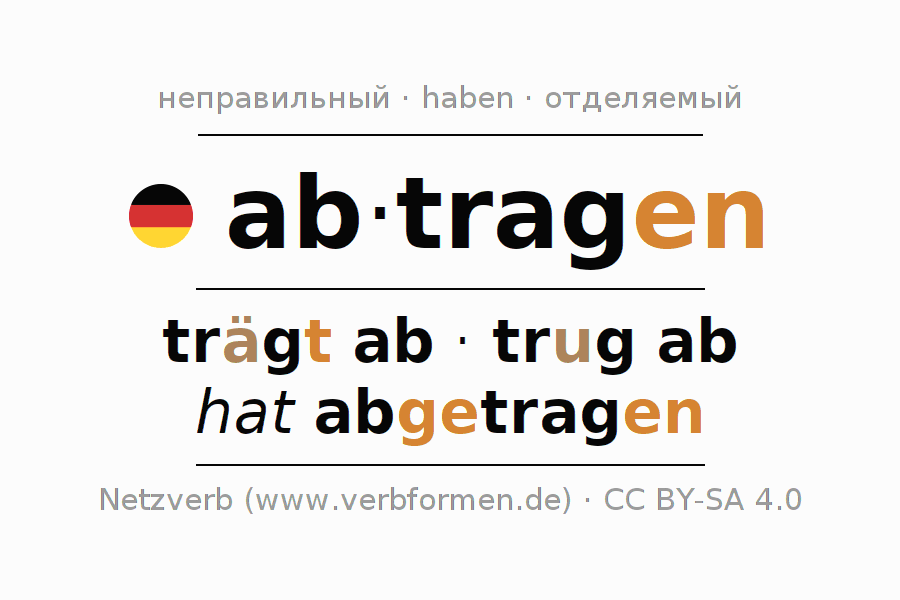 Примеры использования спряжения глаголов в abtragen. При этом речь идёт о реальных предложениях и о предложениях из проекта Tatoeba. Для каждой спряженной формы будет отображаться пример с таким предложением. Глагольная форма будет при этом выделена. Если имеется несколько предложений, будет случайным образом выбран пример с немецким глаголом abtragen. Чтобы понимать спряжение не только в примерах, но и в обучении, доступны листы с глаголом abtragen.