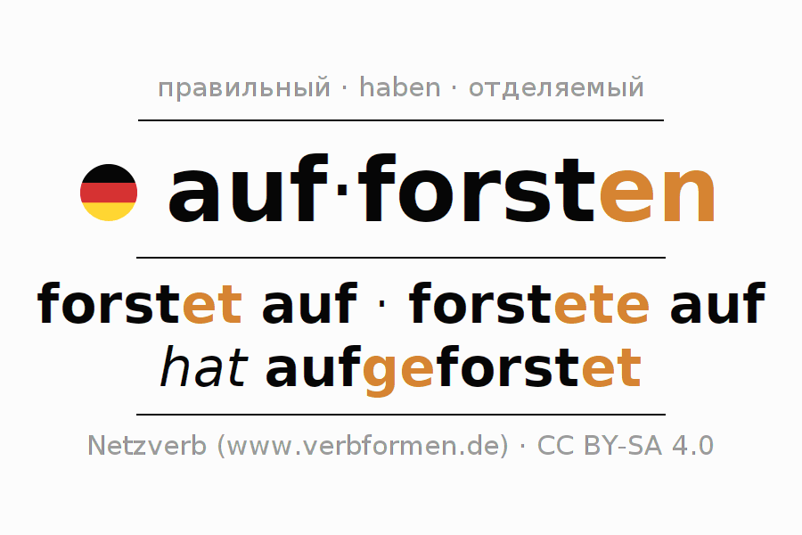 Примеры использования спряжения глаголов в aufforsten. При этом речь идёт о реальных предложениях и о предложениях из проекта Tatoeba. Для каждой спряженной формы будет отображаться пример с таким предложением. Глагольная форма будет при этом выделена. Если имеется несколько предложений, будет случайным образом выбран пример с немецким глаголом aufforsten. Чтобы понимать спряжение не только в примерах, но и в обучении, доступны листы с глаголом aufforsten.