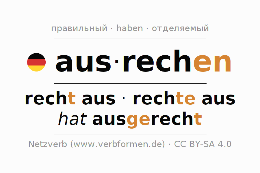 Примеры использования спряжения глаголов в ausrechen. При этом речь идёт о реальных предложениях и о предложениях из проекта Tatoeba. Для каждой спряженной формы будет отображаться пример с таким предложением. Глагольная форма будет при этом выделена. Если имеется несколько предложений, будет случайным образом выбран пример с немецким глаголом ausrechen. Чтобы понимать спряжение не только в примерах, но и в обучении, доступны листы с глаголом ausrechen.