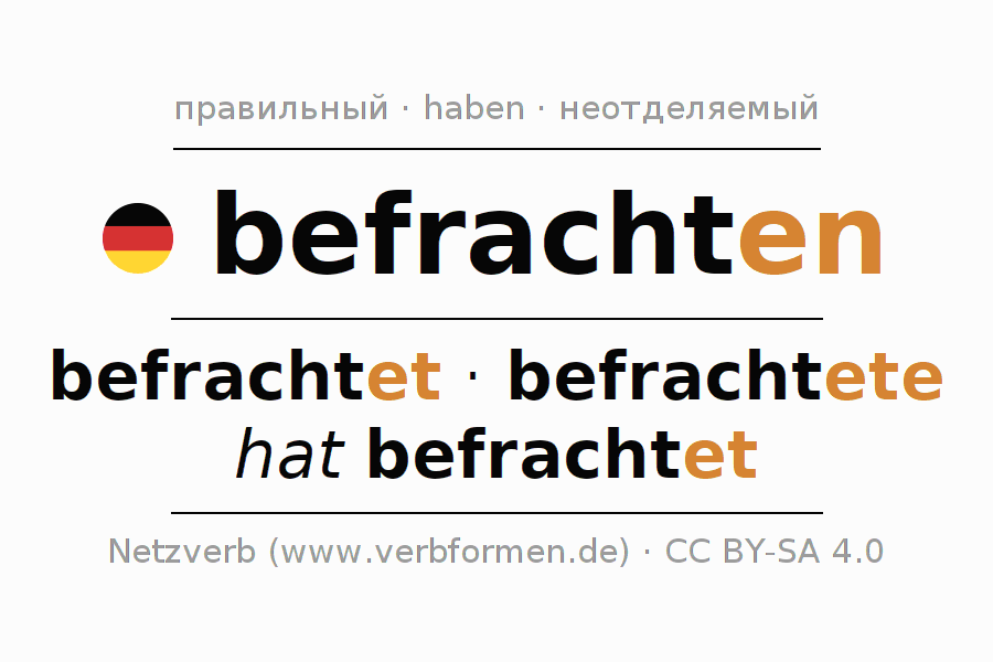 Примеры использования спряжения глаголов в befrachten. При этом речь идёт о реальных предложениях и о предложениях из проекта Tatoeba. Для каждой спряженной формы будет отображаться пример с таким предложением. Глагольная форма будет при этом выделена. Если имеется несколько предложений, будет случайным образом выбран пример с немецким глаголом befrachten. Чтобы понимать спряжение не только в примерах, но и в обучении, доступны листы с глаголом befrachten.