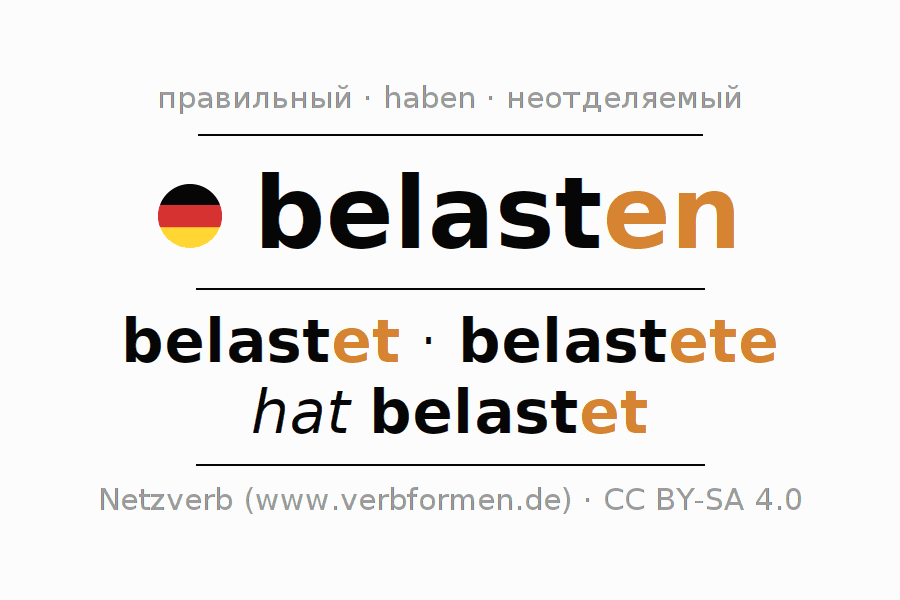 Примеры использования спряжения глаголов в belasten. При этом речь идёт о реальных предложениях и о предложениях из проекта Tatoeba. Для каждой спряженной формы будет отображаться пример с таким предложением. Глагольная форма будет при этом выделена. Если имеется несколько предложений, будет случайным образом выбран пример с немецким глаголом belasten. Чтобы понимать спряжение не только в примерах, но и в обучении, доступны листы с глаголом belasten.