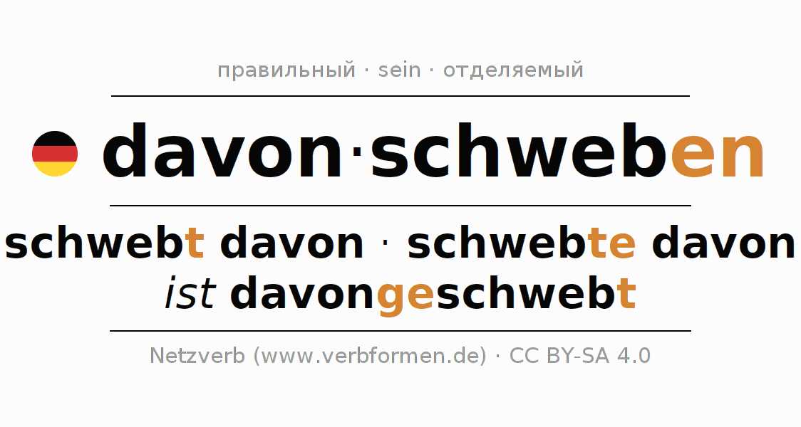 Примеры использования спряжения глаголов в davonschweben. При этом речь идёт о реальных предложениях и о предложениях из проекта Tatoeba. Для каждой спряженной формы будет отображаться пример с таким предложением. Глагольная форма будет при этом выделена. Если имеется несколько предложений, будет случайным образом выбран пример с немецким глаголом davonschweben. Чтобы понимать спряжение не только в примерах, но и в обучении, доступны листы с глаголом davonschweben.