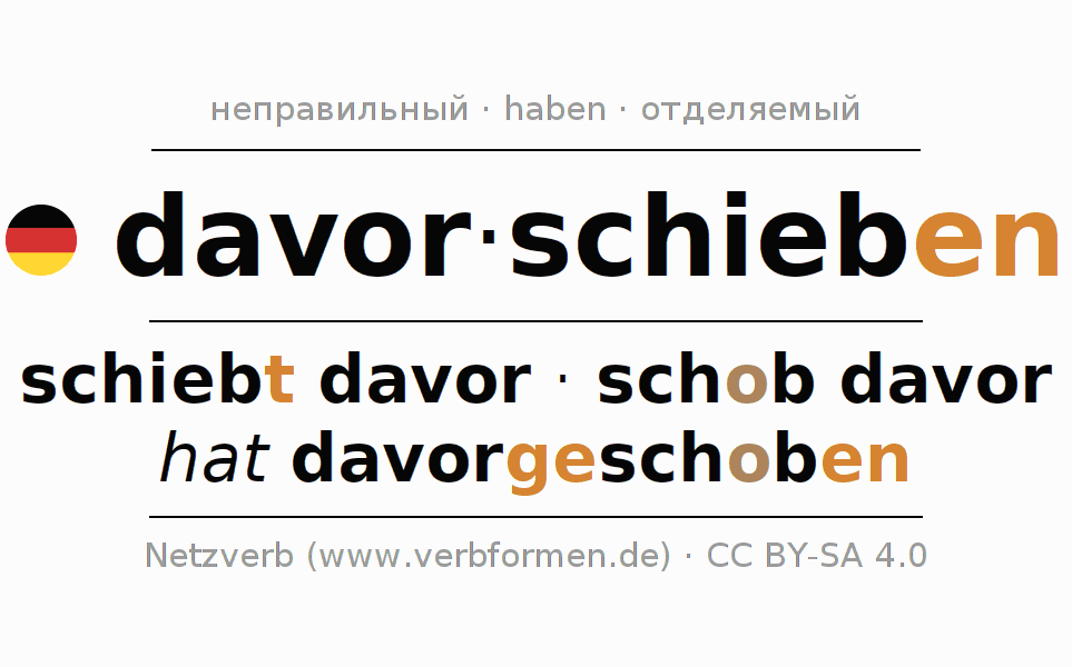 Примеры использования спряжения глаголов в davorschieben. При этом речь идёт о реальных предложениях и о предложениях из проекта Tatoeba. Для каждой спряженной формы будет отображаться пример с таким предложением. Глагольная форма будет при этом выделена. Если имеется несколько предложений, будет случайным образом выбран пример с немецким глаголом davorschieben. Чтобы понимать спряжение не только в примерах, но и в обучении, доступны листы с глаголом davorschieben.